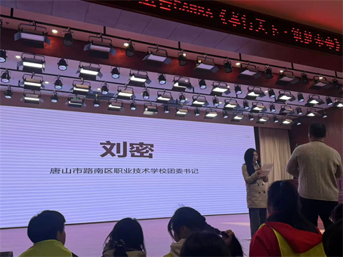 路南区职业技术学校团委书记刘密代表学校讲话,表明活动为德育延伸,希望广大同学学会关爱奉献,融入团队精神于校园生活,展新时代学生风貌,践行公益。