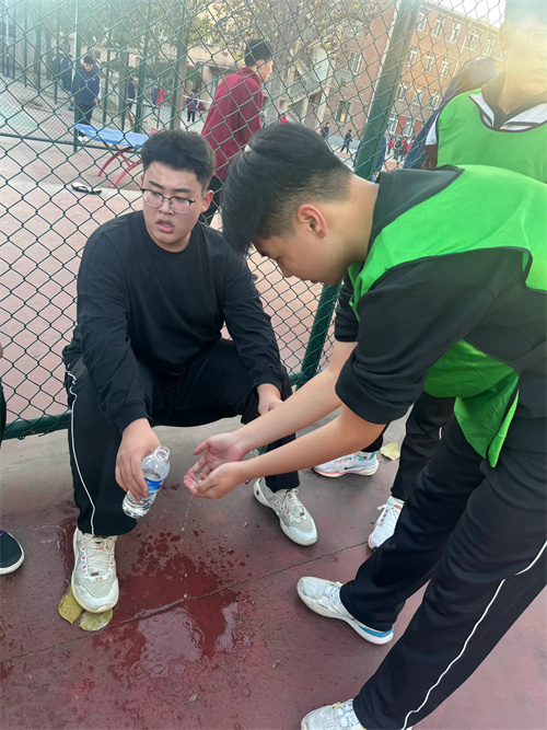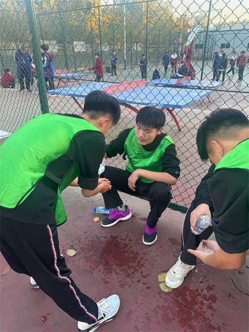 运动员们非常努力的比赛,一旁的同学为运动员拿水擦汗,为受伤的队员按摩。整体氛围充斥着团结友爱,互帮互助