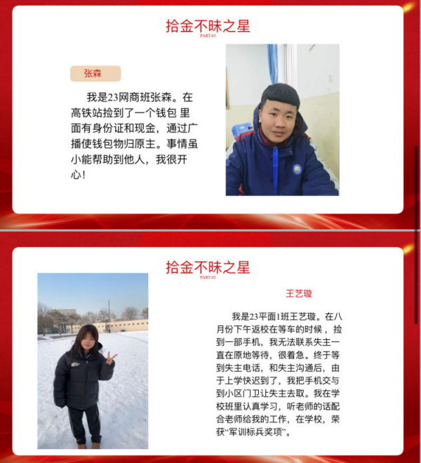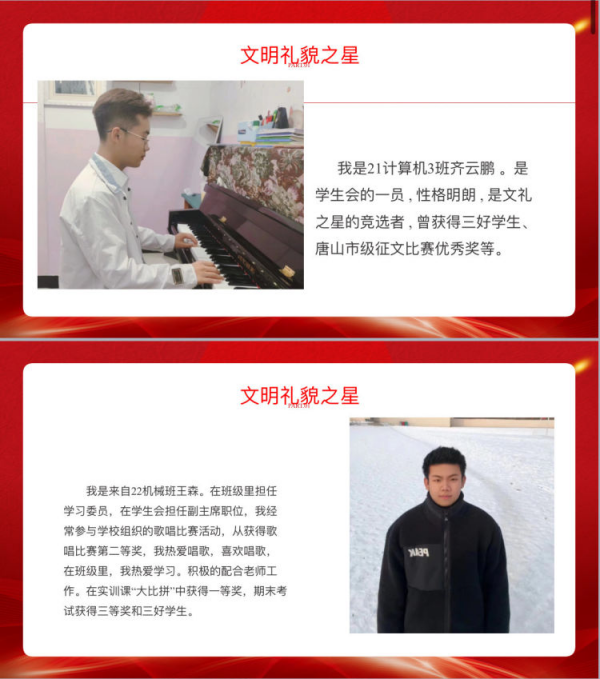 “校园之星”是榜样学生的代表,他们平凡而优秀,自信又大方,在学习中是同学们竞相学习和信赖的对象,在日常生活中是父母的骄傲。经过层层评选,我校齐云鹏、张曦涵、穆文龙、王艺璇、宋世杰被评为2023年路南职校“校园之星”。恭喜他们获得的荣誉,也让我们一起学习身边的榜样,努力前行!