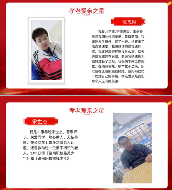 路南职校“校园之星”的评选,对学生进行了多方面的正确引导,帮助学生树立正确的人生观、价值观和世界观,促进学生全面发展,让学生向身边的榜样学习,形成自尊自爱、自主自强、人人“认星争优”的良好校风。