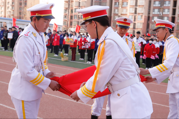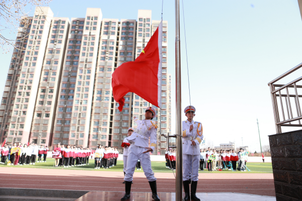 五星红旗在朝阳中冉冉升起,雄壮的国歌声响彻天空。