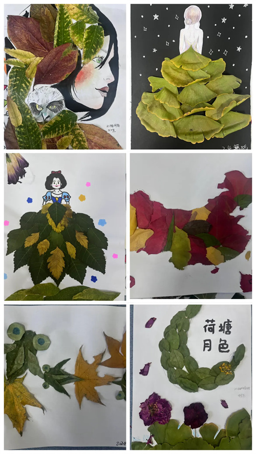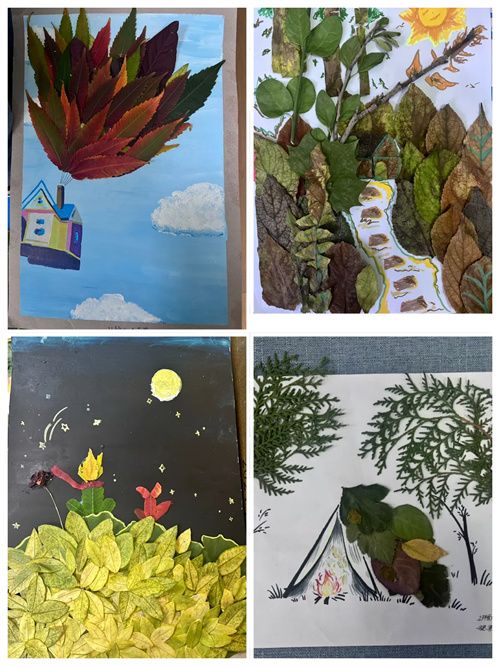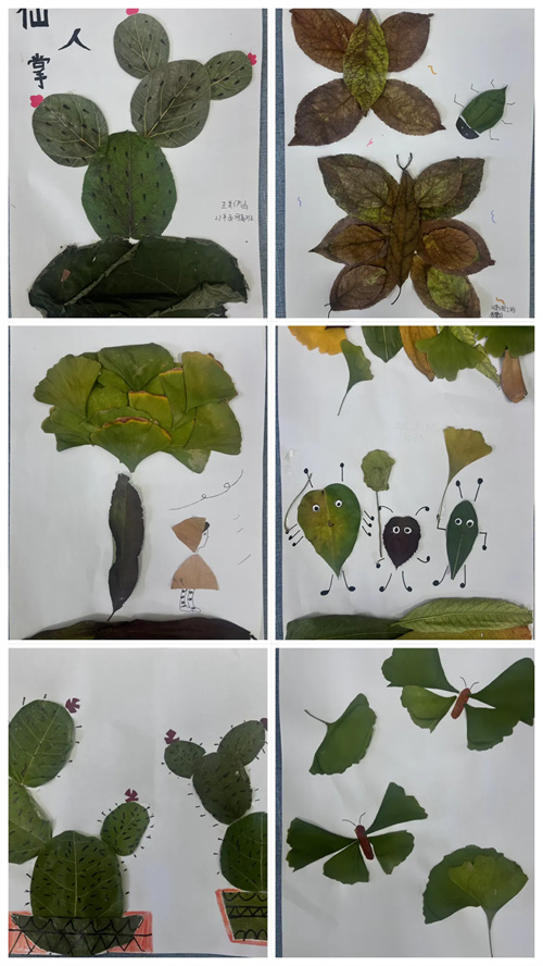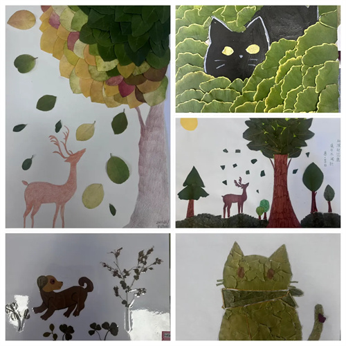 在作品中,一片片灵动的树叶自由自在地玩耍,好不欢乐。同学们的创意,赋予了落叶又一次新的生命。
